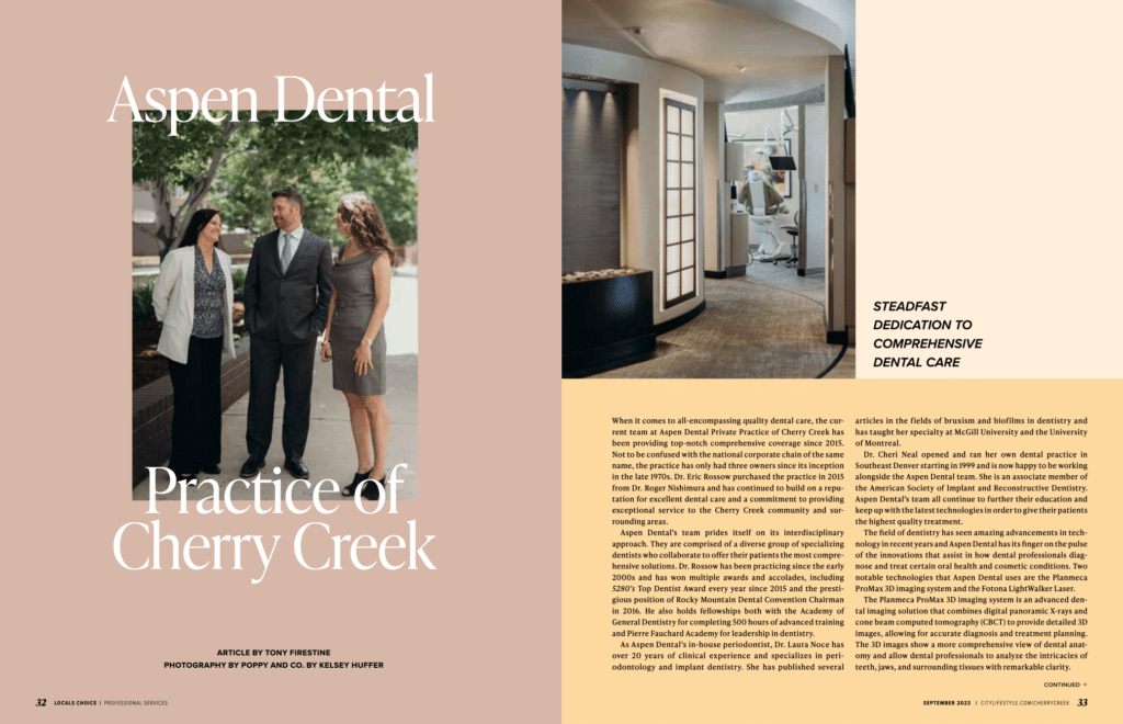 Welcome to Aspen Dental, Private Practice of Cherry Creek in Denver, CO. Together, our dentists, Dr. Eric C. Rossow, Dr. Laura Noce, and Dr. Cheri Neal, have provided superior dental care to the Denver area for 20 years and pride themselves on high-quality treatment and most importantly, patient comfort. With expertise ranging from fillings and dental veneers to dental implants, wisdom tooth extraction, crowns, and bridges, our doctors can now correct seemingly permanent cosmetic dental problems and can literally transform your smile.